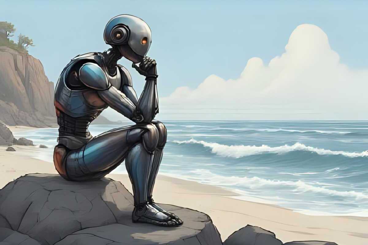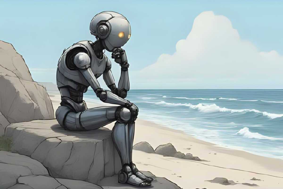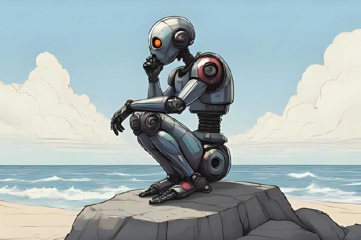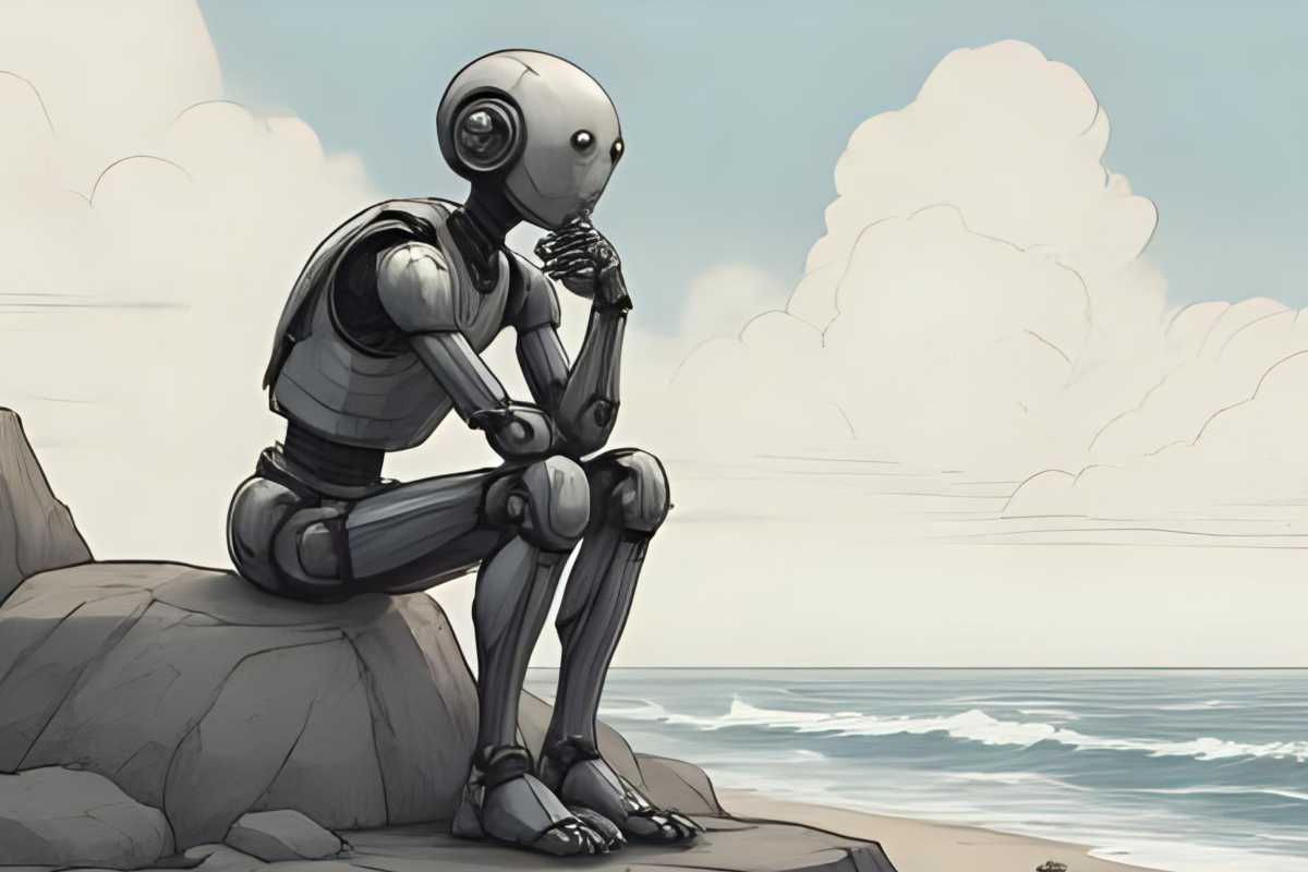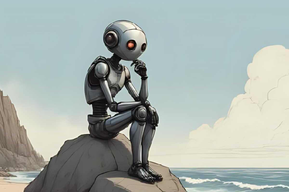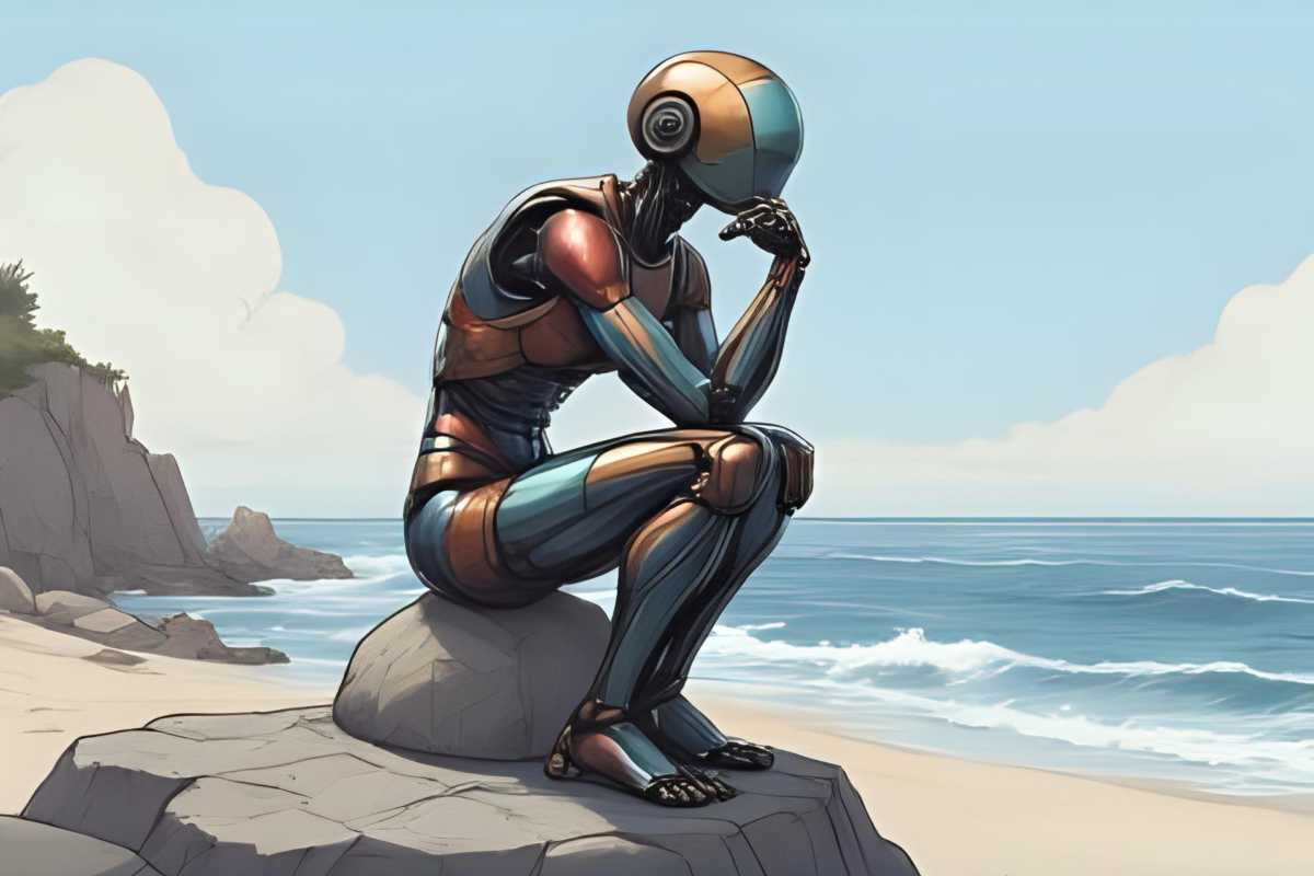 Eines der berühmtesten Kunstwerke der letzten beiden Jahrhunderte ist “Der Denker" von Auguste Rodin. Dieses Kunstwerk sieht man in Werbeanzeigen, in Filmen und viele kreative Köpfe haben den Denker als Grundlage für eigenes Schaffen genutzt. Charlie Chaplin hat in seinem Meisterwerk “Der große Diktator” den “neuen Denker” mit ausgestrecktem Arm als faschistischem Gruß. Carl Barks hat in einer Donald Duck Geschichte eine nachdenkliche Kuh in einem Bilderrahmen als Detail im Hintergrund. Warum also sollten man nicht einmal einen Roboter nehmen, um ihn in der Pose des Denkers zu zeigen? Nach einer intensiven Auseinandersetzung mit einem Agenten der Künstlichen Intelligenz habe ich Texte für den Prompt erarbeitet, um einen denkenden Roboter an den Strand und in eine Umgebung für Kunstwerke zu setzen. Entstanden ist eine KI Bildergalerie.