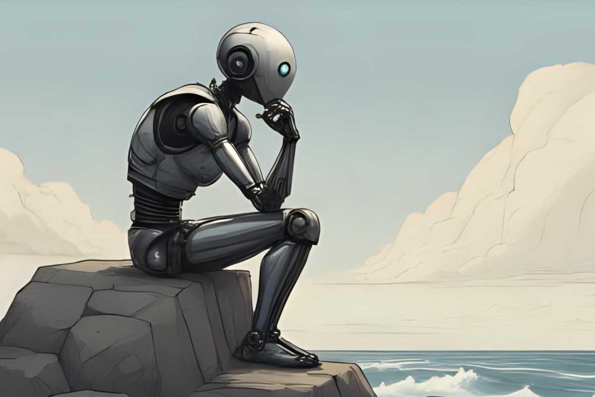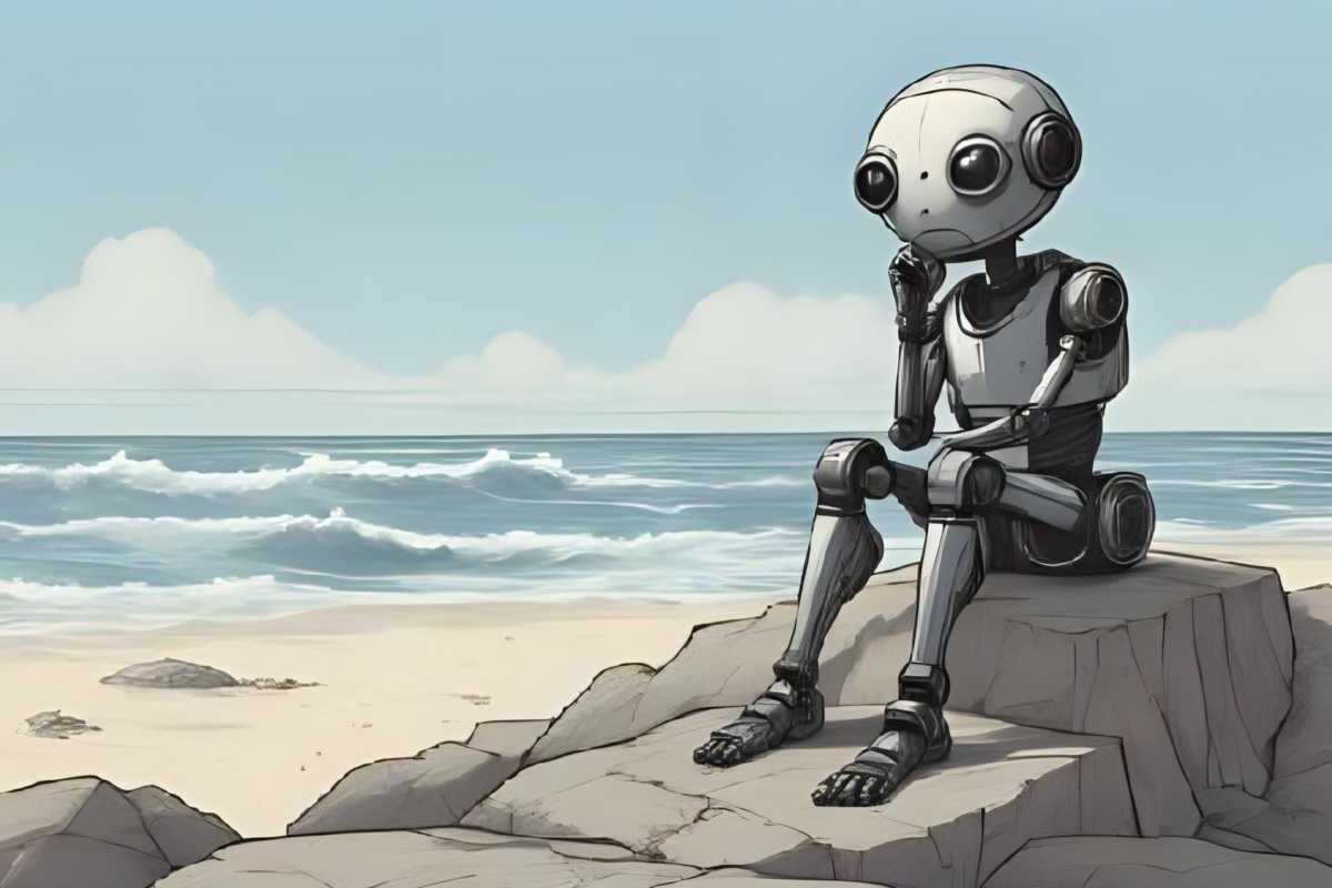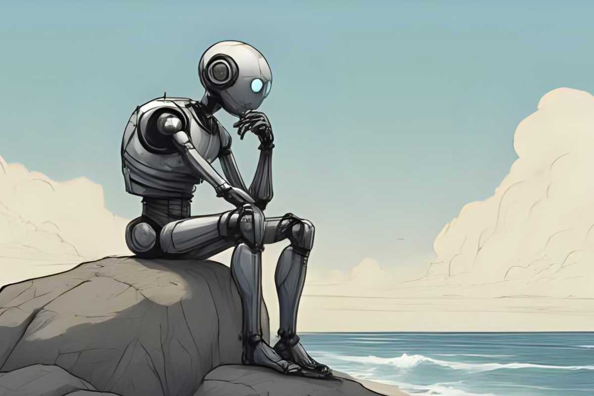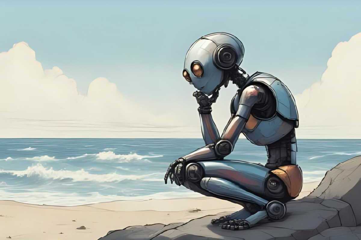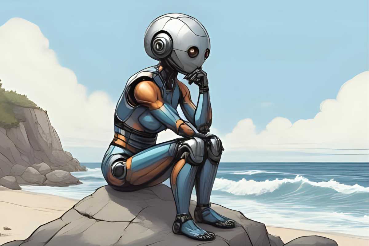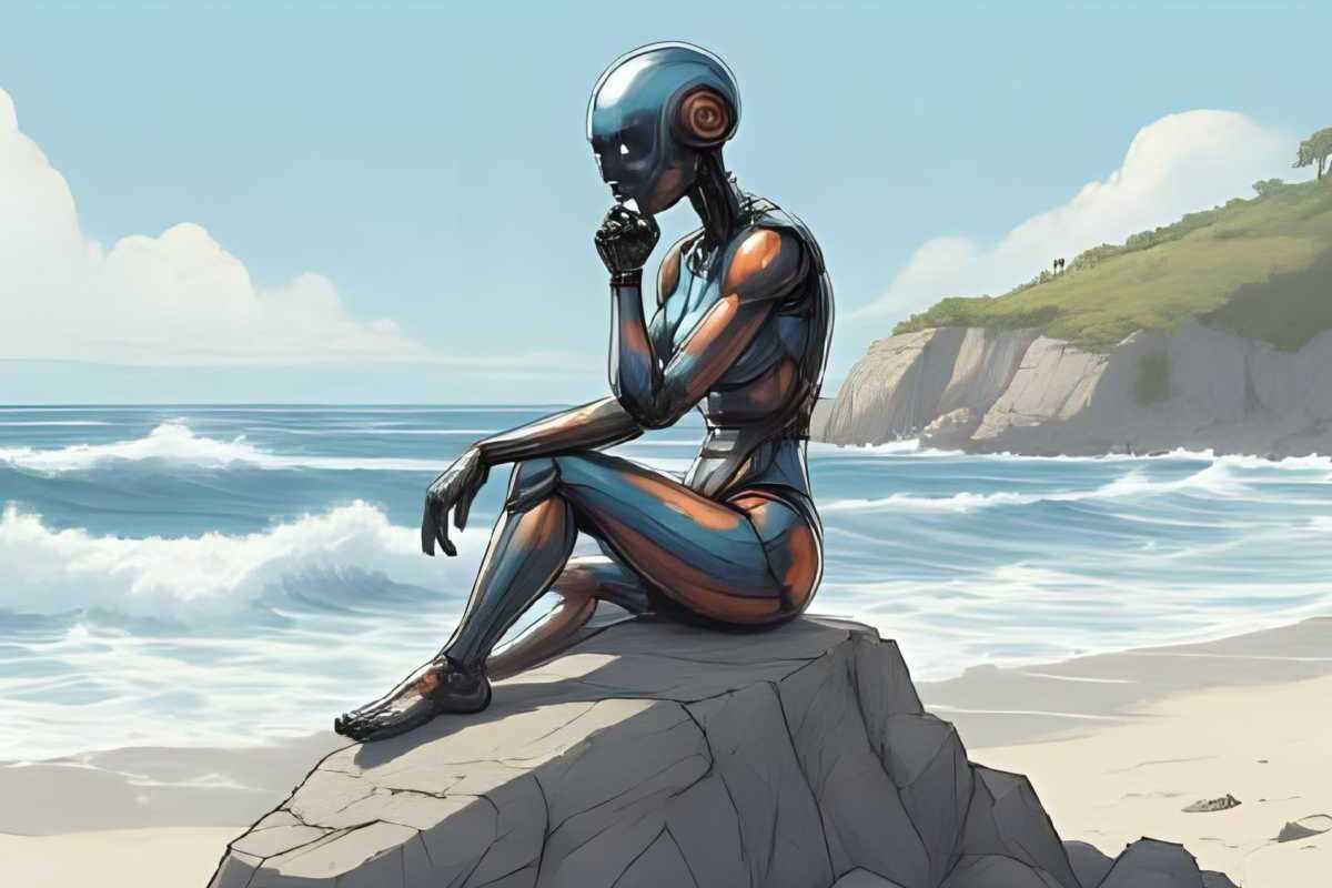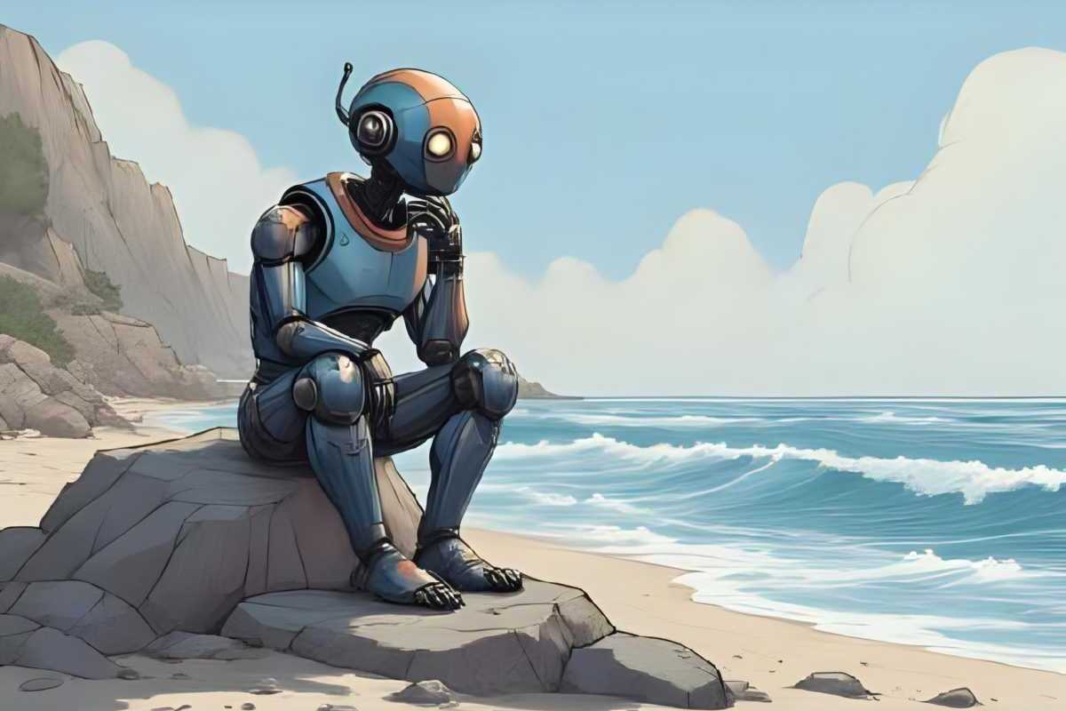 Eines der berühmtesten Kunstwerke der letzten beiden Jahrhunderte ist “Der Denker" von Auguste Rodin. Dieses Kunstwerk sieht man in Werbeanzeigen, in Filmen und viele kreative Köpfe haben den Denker als Grundlage für eigenes Schaffen genutzt. Charlie Chaplin hat in seinem Meisterwerk “Der große Diktator” den “neuen Denker” mit ausgestrecktem Arm als faschistischem Gruß. Carl Barks hat in einer Donald Duck Geschichte eine nachdenkliche Kuh in einem Bilderrahmen als Detail im Hintergrund. Warum also sollten man nicht einmal einen Roboter nehmen, um ihn in der Pose des Denkers zu zeigen? Nach einer intensiven Auseinandersetzung mit einem Agenten der Künstlichen Intelligenz habe ich Texte für den Prompt erarbeitet, um einen denkenden Roboter an den Strand und in eine Umgebung für Kunstwerke zu setzen. Entstanden ist eine KI Bildergalerie.