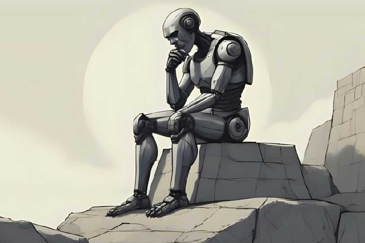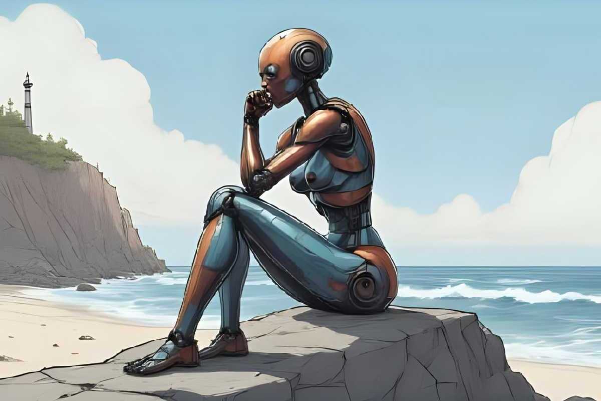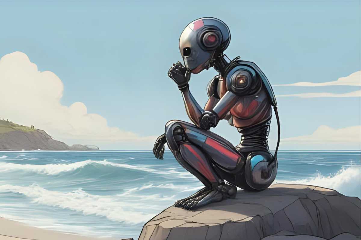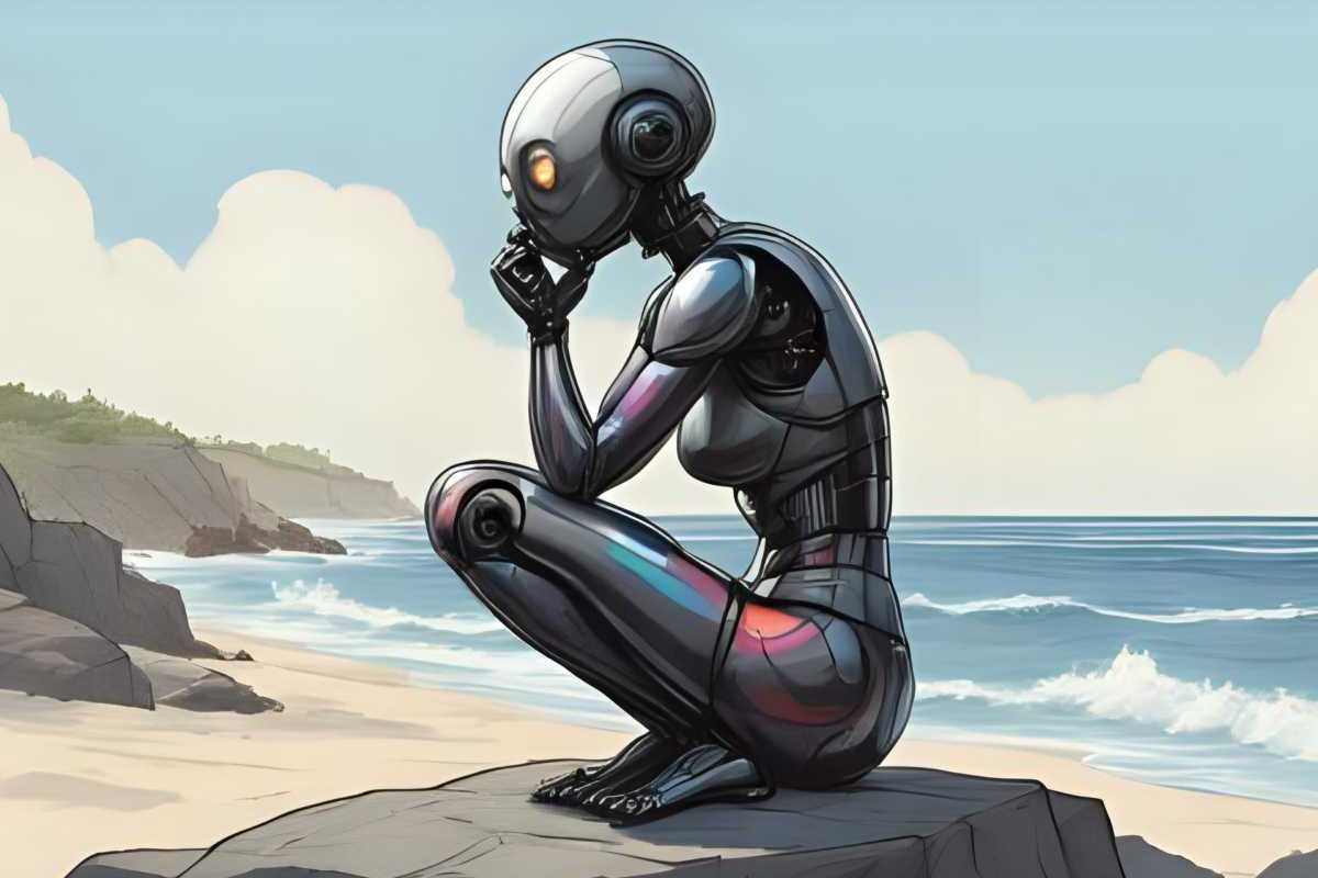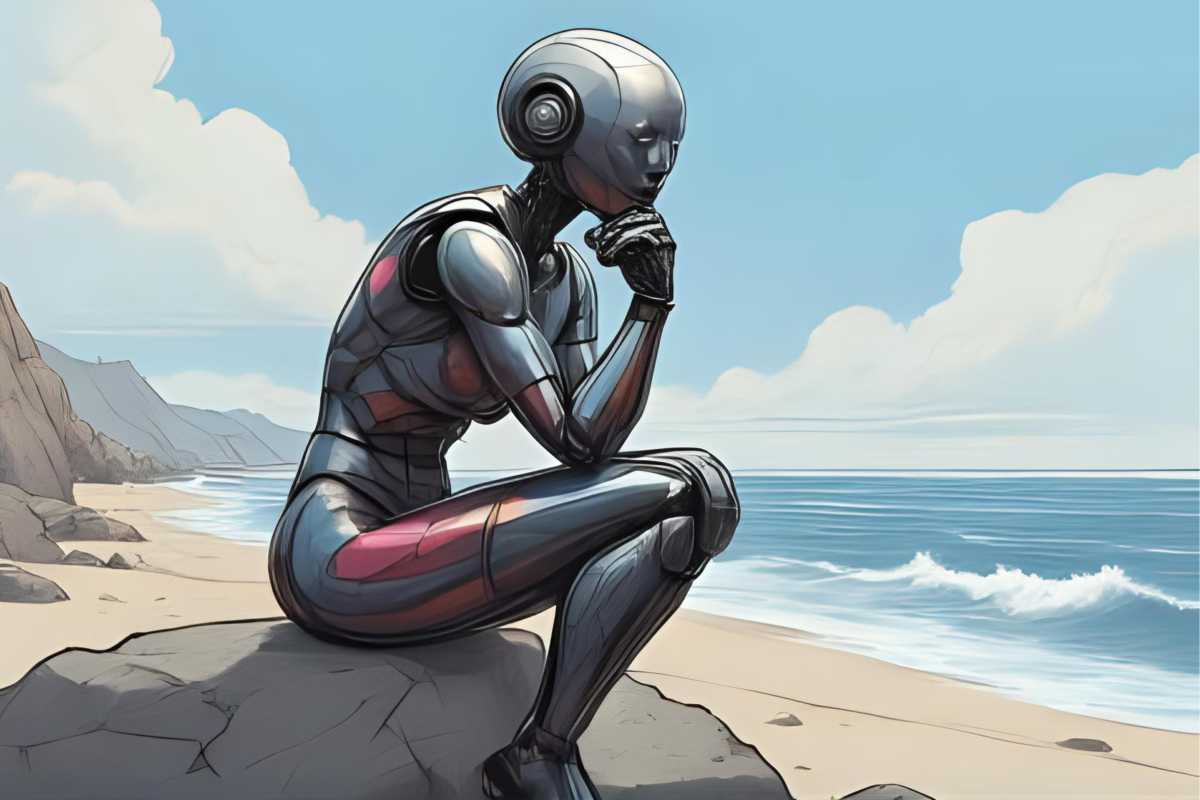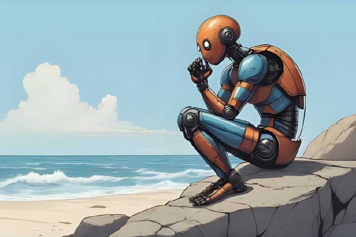 Eines der berühmtesten Kunstwerke der letzten beiden Jahrhunderte ist “Der Denker" von Auguste Rodin. Dieses Kunstwerk sieht man in Werbeanzeigen, in Filmen und viele kreative Köpfe haben den Denker als Grundlage für eigenes Schaffen genutzt. Charlie Chaplin hat in seinem Meisterwerk “Der große Diktator” den “neuen Denker” mit ausgestrecktem Arm als faschistischem Gruß. Carl Barks hat in einer Donald Duck Geschichte eine nachdenkliche Kuh in einem Bilderrahmen als Detail im Hintergrund. Warum also sollten man nicht einmal einen Roboter nehmen, um ihn in der Pose des Denkers zu zeigen? Nach einer intensiven Auseinandersetzung mit einem Agenten der Künstlichen Intelligenz habe ich Texte für den Prompt erarbeitet, um einen denkenden Roboter an den Strand und in eine Umgebung für Kunstwerke zu setzen. Entstanden ist eine KI Bildergalerie.